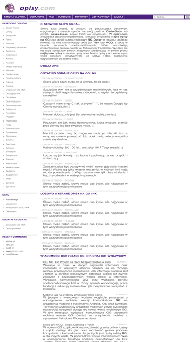 85%opisy na gadu-gadu i portal nk. tysiące fajnych opisów gg dla ciebie i twoich znajomych. tutaj znajdziesz i pobierzesz najlepsze opisy na gg oraz naszą-klasę.