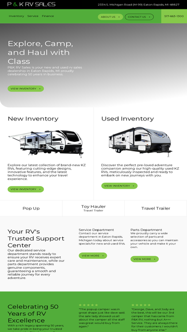 81%Embark on unforgettable journeys with P&K RV Sales in Eaton Rapids, MI. Discover a premier selection of new and used RVs for sale and trade.