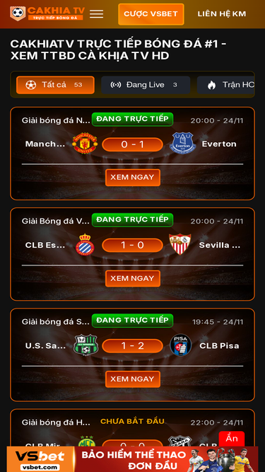 72%CakhiaTV trực tiếp bóng đá Full HD, link nhanh, miễn phí, không giật lag. Xem mọi giải đấu lớn nhỏ: EPL, C1, La Liga, Serie A, V-League, hỗ trợ mọi thiết bị.
