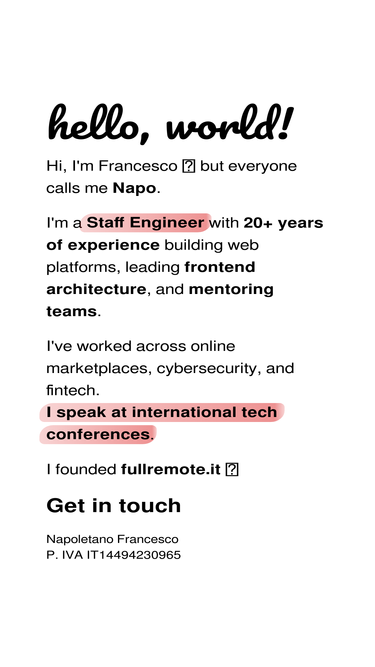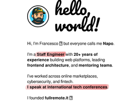 71%Francesco Napoletano is a highly competent staff software engineer with 20+ years of experience developing a wide range of tools and applications for the web stack.