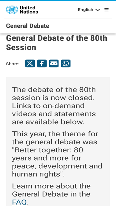 86%أسئلة شائعة المناقشة العامة س1. ما هي المناقشة العامة؟ تُعدّ المناقشة العامة الاجتماع السنوي لرؤساء الدول والحكومات في مستهلّ دورة الجمعية العامة. وهي غالبًا ما تكون أول مناقشة تُعقد في الدورة، وتُعد — باستثناء الاجتماعات الرفيعة المستوى — الفعالية الوحيدة التي يشارك فيها رؤساء الدول والحكومات على نحو منتظم.
