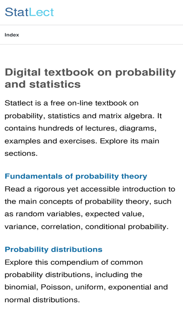 100%online book containing hundreds of lectures on probability, statistics and matrix algebra. ideal for self-study.