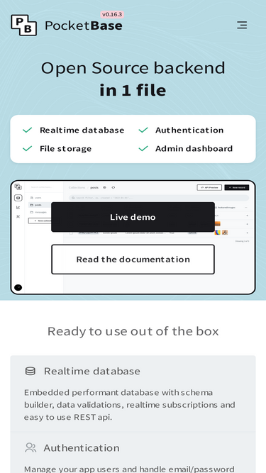 100%Open Source backend in 1 file with realtime database, authentication, file storage and admin dashboard