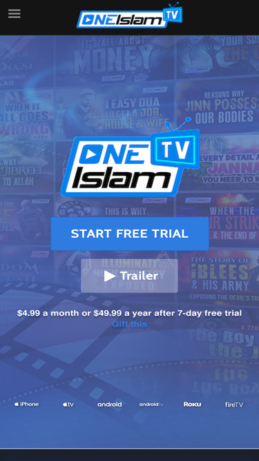 100%The world-famous One Islam Productions channel is now available on most major online platforms. You can enjoy countless hours of high-quality and powerful Islamic educational videos on demand using the One Islam TV APP. One Islam TV assures you get: * ZERO ADs * No more annoying or inappropriate ADs will pop up. * 100% HALAL CONTENT * All content is according to the Quran & Sunnah. * ALL VIDEOS ARE MUSIC FREE * Featuring only voice and natural sounds. * YOUR SUBSCRIPTION FEE IS A SADAQAH JARIYAH * You get rewards for supporting our work. Subscribe now for a 7 day free trial! Your subscription gives you complete access to 100's of videos to choose from: - Powerful Islamic Videos - Lives of the Prophets Series - Nasheed (Voice only & music free song) - Quran Videos - Islamic Stories - Lectures by Various Scholars & Speakers Plus hundreds of videos on various Islamic topics with new content added daily inshallah. By subscribing you are directly supporting One Islam Productions in helping them to produce new programs and shows which is a SADAQAH JARIYAH (continuous charity for you).