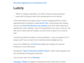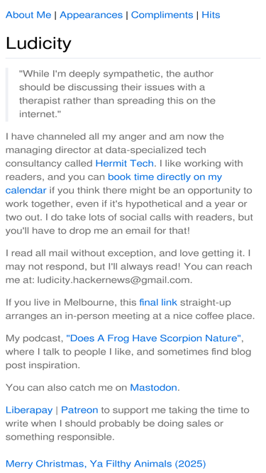 82%"wow, if i was the leader of this person's company i would immediately terminate them." reader mail is the only thing that brings me joy in this cruel world of spreadsheets and sprints: ludicity.hackernews@gmail.com, but will take a while to reply after the deluge of emails following the ai post. i do read everything. i will prioritize responding if: you live in melbourne and want coffee. you are a student seeking advice. you are an unemployed engineer that shares my values who needs help, especially from marginalized communities. you want to invite me onto a podcast or something because the flames of my ego are a roaring inferno that needs constant feeding, to the dismay of all those around me. podcast which is just me chatting with readers and friends, get those famous clout-chasers outta here. mastodon because it's so much nicer than twitter. twitter which only exists so that i can comment on posts whenever i'm featured on a podcast, which is not a sentence i ever expected to type. liberapay | patreon so that i become less vulnerable to corporate cancellation.