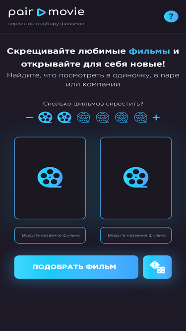 92%скрещивайте свои любимые фильмы и находите новые, которые вам понравятся. сервис подбора фильмов для просмотра в одиночку, в паре или компании. рекомендации на основе любимых фильмов, которые понравятся всем. pair movie - сайт для выбора фильма для двоих. аналог date night movies на русском.