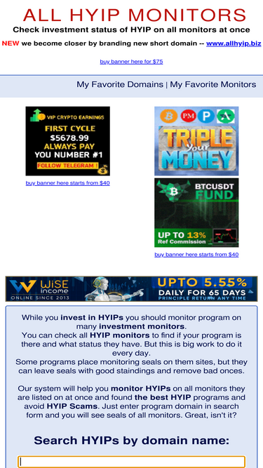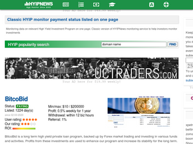 99%hyip investments monitor and hyip monitoring service current online on one page, archive monitoring data, rating of hyip and their payment status.