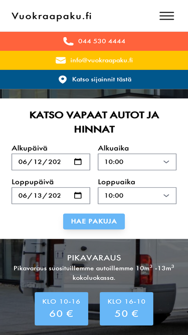 83%Pakettiauton vuokraus halvalla. Vuokraa pakettiauto Helsingissä. Hae ja palauta 24/7. Ei luottokorttipakkoa. Vuokraa paku edullisesti Vuokraapaku.fi -palvelun kautta nyt!