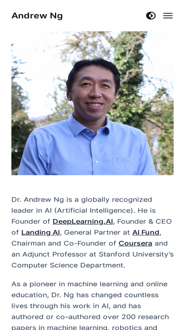 73%Andrew Ng has helped millions of people learn AI. Founder of DeepLearning.AI, AI Fund, and LandingAI. Co-Founder of Coursera. Board Director at Amazon.