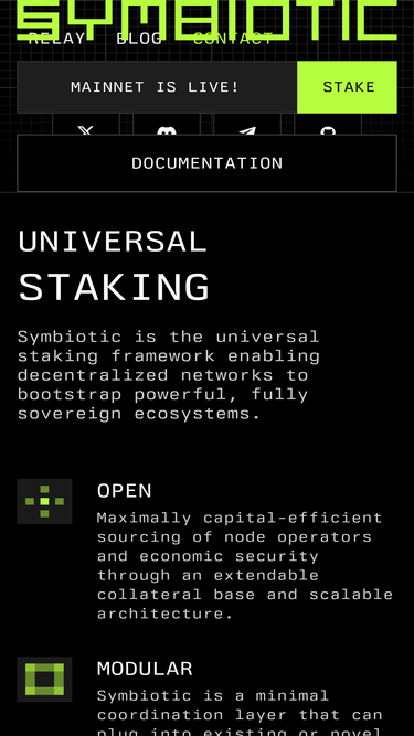 75%Symbiotic is a generalized shared security system enabling decentralized networks to bootstrap powerful, fully sovereign ecosystems.