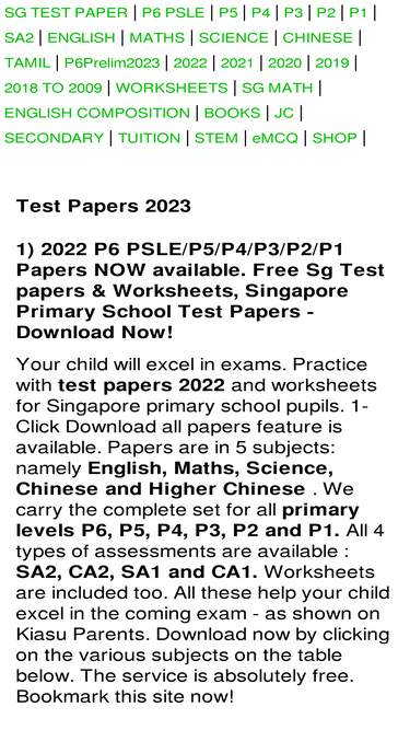 70%free p1-p6 exam papers, featured in kiasu parents. step by step answers are available. practice with free test papers 2022 weekly exam solutions and worksheets for singapore primary school pupils: english, composition, maths, science, chinese and higher chinese. we carry the complete set for all primary levels p6, p5, p4, p3, p2 and p1. all 4 types of assessments are available : sa2, ca2, sa1 and ca1. past papers are available for years: 2022, 2021, 2020, 2019, 2018, 2017, 2016, 2015 to as old as 2009