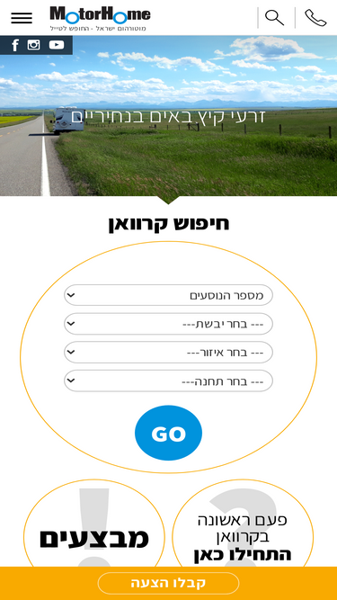 96%מוטורהום ישראל - החברה הגדולה והמובילה בישראל להשכרת קרוונים וקמפרים בארצות הברית, קנדה, אירופה, סקנדינביה, אוסטרליה, ניו זילנד ודרום אפריקה. באתר תמצאו מבחר גדול של דגמי קרוואנים, חבילות "טוס וסע", מכתבי מטיילים וסיפורי מסע, טיפים ומסלולי טיול עם קרוואן, מבצעים וחדשות, הסברים לתפעול הקרוון וסרטי המחשה, רעיונות לטיולי בר מצווה / בת מצווה וגיל הזהב, מידע ופתרונות למטיילים בחו"ל עם מגבלות כשרות ואלרגיה למזון. האתר מאפשר הזמנה של קרוואנים וקמפינג "און ליין".