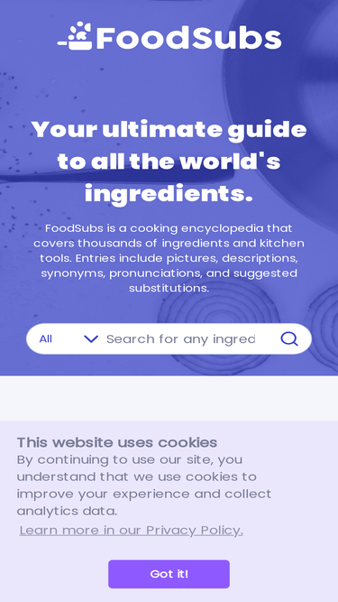 30%foodsubs is a cooking encyclopedia with ingredient substitutions, ingredient synonyms, descriptions, photos, and nutritional information for thousands of ingredients.