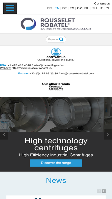 rousselet centrifugation and its subsidiary robatel inc, through the trademark rousselet robatel, design and manufacture industrial centrifuges for the solid / liquid separation and liquid / liquid extraction for the chemical, pharmaceutical, cosmetic, biotechnology, textile, food and metalworking industries