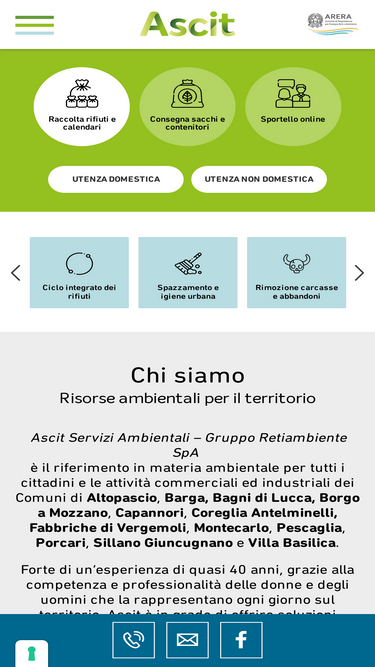 85%ASCIT Servizi Ambientali – Gruppo Retiambiente SpA è il riferimento in materia ambientale per tutti i cittadini e le attività commerciali ed industriali dei Comuni di Altopascio, Barga, Borgo a Mozzano, Capannori, Fabbriche di Vergemoli, Montecarlo, Pescaglia, Porcari, Sillano Giuncugnano e Villa Basilica.Forte di un’esperienza di quasi 40 anni, grazie alla competenza e professionalità delle donne e degli uomini che la rappresentano ogni giorno sul territorio, ASCIT SpA è in grado di offrire soluzioni efficaci e sostenibili a servizio del ciclo integrato dei rifiuti urbani e del trasporto ed avvio a recupero dei rifiuti speciali, per un futuro più pulito ed un’economia sempre più circolare
