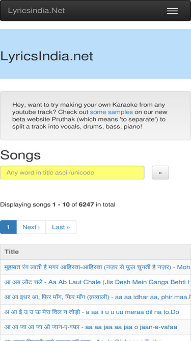 lyricsindia.net has hindi film (bollywood) song lyrics for thousands of songs. the lyrics are presented in ascii and unicode devanagari with an innovative interface for searching and browsing related songs.