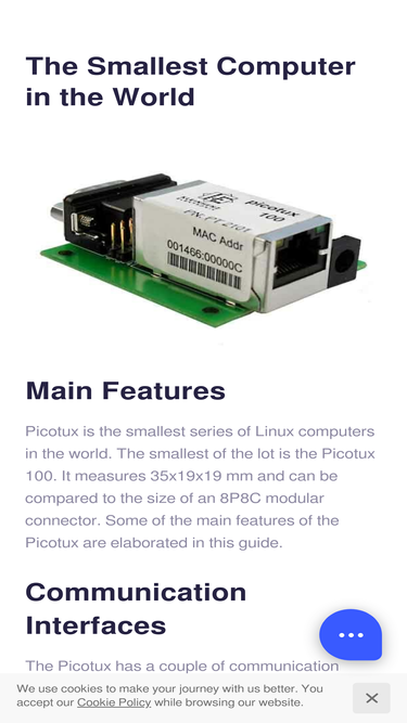 100%main features picotux is the smallest series of linux computers in the world. the smallest of the lot is the picotux 100. it measures 35x19x19 mm and can be compared to the size of an 8p8c modular connector. some of the main features of the picotux are elaborated in this guide. communication interfaces the picotux …