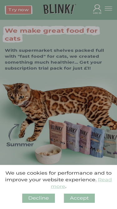 92%Amazing cat food. Try Blink - Cat food subscription now! With supermarket shelves packed full with "fast food" for cats, we created something much healthier... Get your subscription trial pack for just £1!
