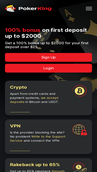 76%PokerKing offers you 100% bonus up to $2,000 with 65%+ rakeback. MTT players can join our record-breaking tournaments The Venom with buy-in $2,650.