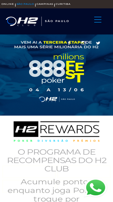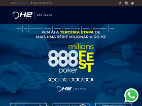 Realizando torneios diários, semanais e com diversos formatos e estruturas, o H2 Club está aberto diariamente, 7 dias por semana, 363 dias do ano! Área Exclusiva para Fumantes, Canais Premiere, Restaurante 24h, Wifi e muito mais. Página Inicial