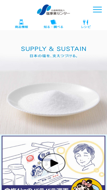 83%塩に関する調査研究、家庭用の塩の販売等を行う塩事業センターのサイトです。食塩などの商品情報や賞味期限について、塩の結晶づくりなど自由研究に役立つ実験、塩田など塩づくりの歴史、レシピや料理のコツ、研究機関・海水総合研究所などをご紹介。