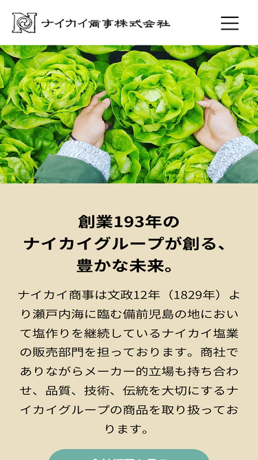 54%ナイカイ商事株式会社は文政12年(1829年)より瀬戸内海に臨む備前児島の地において塩作りを継続しているナイカイ塩業の販売部門を担っております。商社でありながらメーカー的立場も持ち合わせ、品質、技術、伝統を大切にするナイカイグループの商品を取り扱っております。