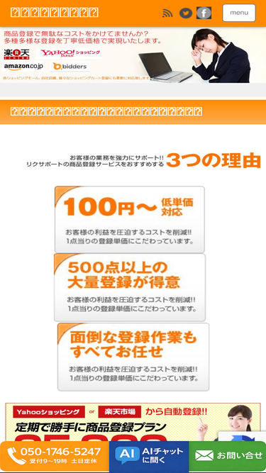 84%面倒な商品登録を一括代行いたします 商品登録ドットコムではこのようなわずらわしい作業をお受けしております。 楽天市場・ヤフーショッピング(Yahoo!ショッピング)・ヤフーオークション・Amazon(アマゾン・セラーセン […]