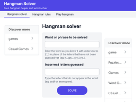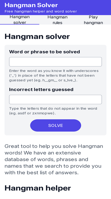 100%Help yourself with our hangman solver tool. Free hangman helper, easy to use word solver for the hangman game and other word games like crosswords.