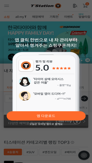 티스테이션 공식 온라인 스토어에서 타이어 쇼핑과 all my T 서비스로 내 차 관리까지 한 번에! 한국타이어, 라우펜, 미쉐린, 콘티넨탈, 브리지스톤, 피렐리, 굿이어 무료배송·무료장착!