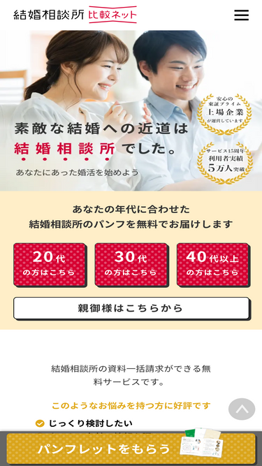 87%厳選17社!結婚相談所の資料を一括請求できる『結婚相談所比較ネット』は、優良な結婚相談所のみをご紹介しているので安心してご利用いただけます。結婚相談所のパンフレットをまとめてお取り寄せしてこっそり婚活始めてみませんか?