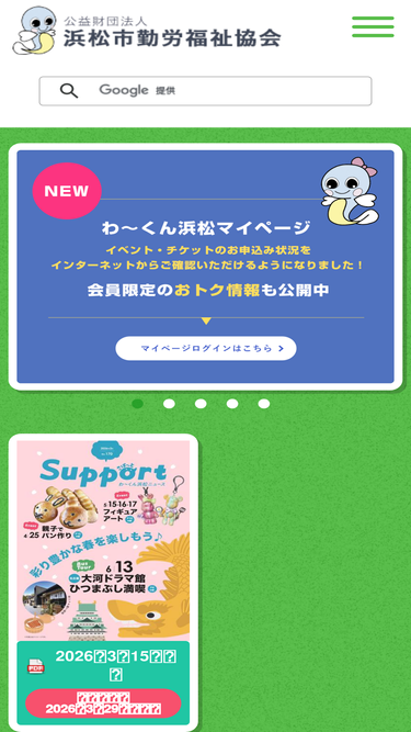 98%浜松市と湖西市の中小企業の福利厚生はわ~くん浜松にお任せください!わ~くん浜松では浜松市・湖西市内の中小企業で働く方とそのご家族のために、様々な福利厚生サービスを提供しています。イベントやお得なチケットのお申込、慶弔給付金や助成金など各種手続きについてご案内しています。