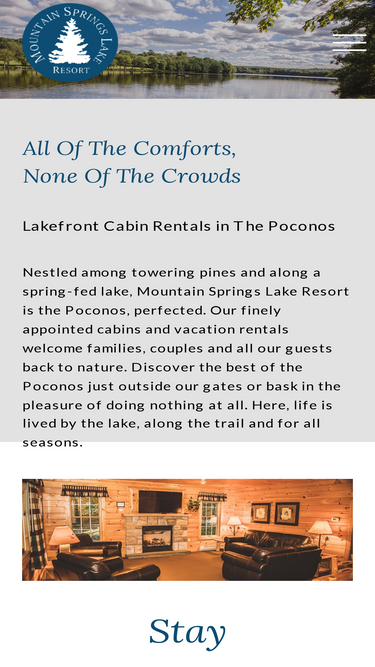 85%Reserve a romantic retreat in the Poconos at Mountain Springs Lake Resort. Finely appointed, with modern amenities, these adults-only cabins are perfect for a lovebirds getaway.