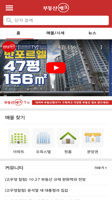부동산뱅크, 부동산 정보, 아파트 시세, 매물, 부동산 뉴스, 부동산 상담 등을 제공하는 부동산 종합 포탈 사이트