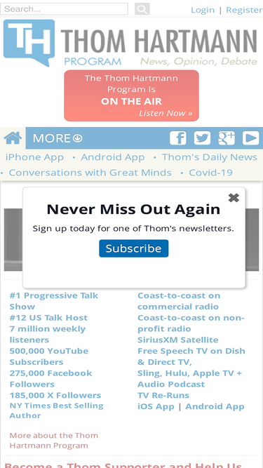 Listen live to Thom Hartmann's streaming radio show online & on radio and TV stations across the U.S., Canada, Africa and Europe, between noon and 3pm ET.