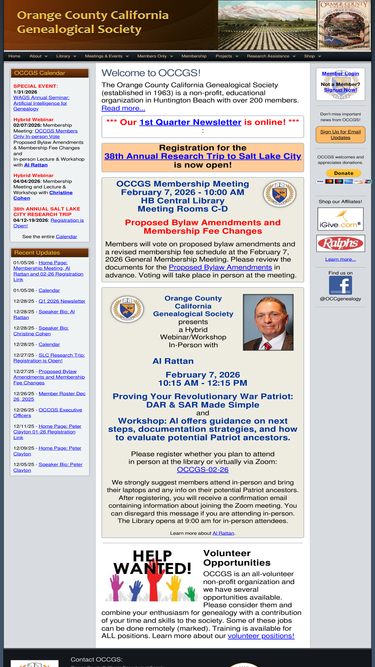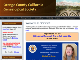100%the orange county california genealogical society (established in 1963) is a non-profit, educational organization in huntington beach with 400 members. its purpose is to collect, preserve and disseminate knowledge and information in regards to genealogy and related historical, biographical and heraldic data.