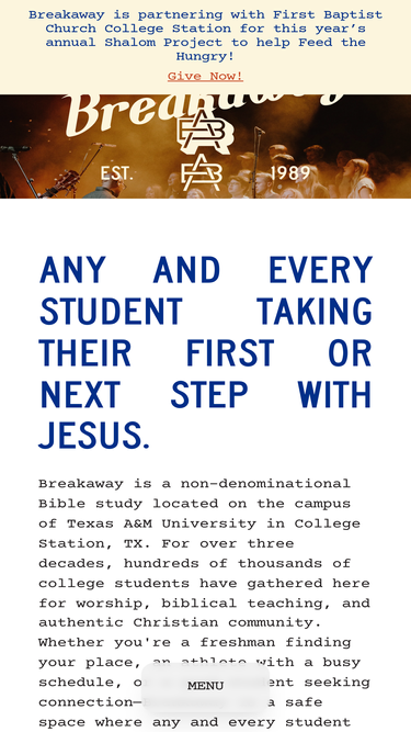 90%Join thousands of students every Tuesday at 9PM for Breakaway - a place where you belong before you believe. Whether you're curious, skeptical, or wanting deeper discipleship, there's a seat saved for you.