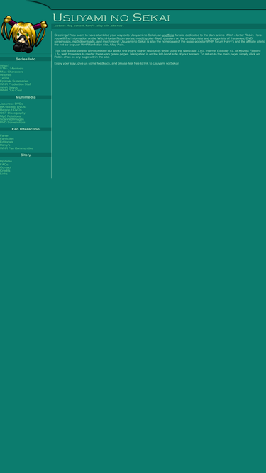 100%A small fansite to the dark anime series Witch Hunter Robin. Features mp3 rotations, character profiles, DVD information, fanworks, fan interaction portals, and more.