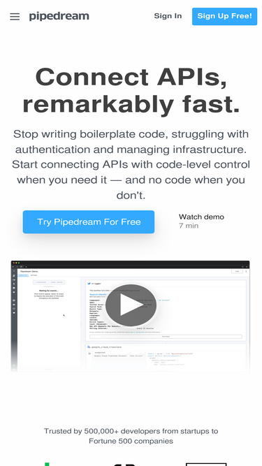73%pipedream is a low code integration platform for developers that allows you to connect apis remarkably fast. stop writing boilerplate code, struggling with authentication and managing infrastructure. start connecting apis with code-level control when you need it — and no code when you don't. join 250,000+ developers using the pipedream platform today. get started for free.