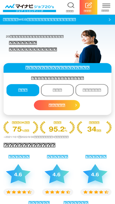 80%マイナビジョブ20'sスカウトとは20代・第二新卒・既卒向け転職スカウトサービスです。プロフィール登録をすると企業の採用担当者から直接スカウトが届き、オファー内容によっては選考をスキップできたりと効率よくご自身のタイミングに合わせて転職・就職活動ができます。