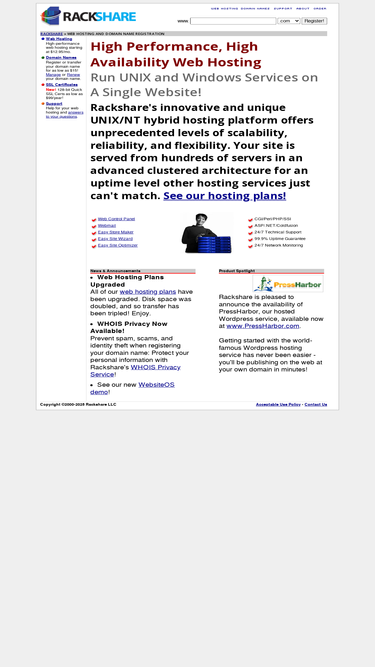 90%rackshare.com shares rack space with you - no need to buy a dedicated server when you can share one! rackshare provides domain name registration and web hosting services to individuals, small businesses, and web developers. rackshare deploys cobalt raq linux (tm) web server appliances at secure, high-speed data centers to provide easy-to-use, fully-supported, open standards-based web and email hosting solutions.