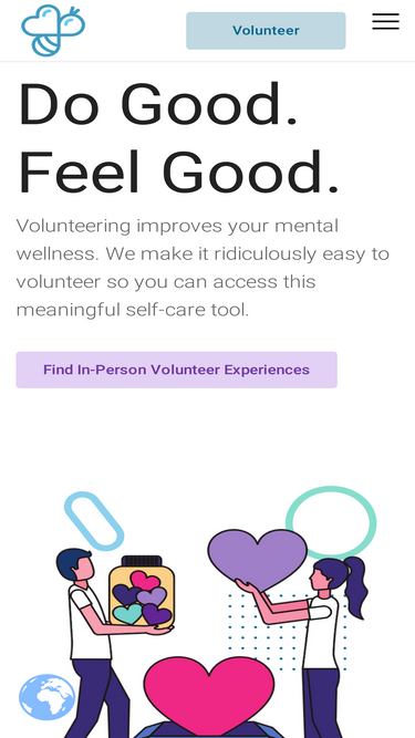 80%Do Good.Feel Good. Volunteering improves your mental wellness. We make it ridiculously easy to volunteer so you can access this meaningful self-care tool. Find In-Person Volunteer Experiences Love Our Work? Please consider supporting our mission with a donation. Support Us Companies Looking for unique, turn-key solutions to engage your team or company in a volunteer