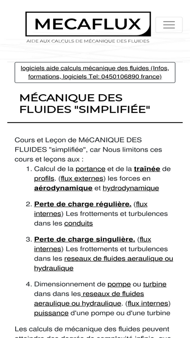 28%mecaflux leçons de mécanique des fluides simplifiée, logiciel, explications, exemples de calculs,données et liens sur la mécanique des fluides l'aerodynamique l'hydrodynamique , pertes charge hydraulique pompes turbines
