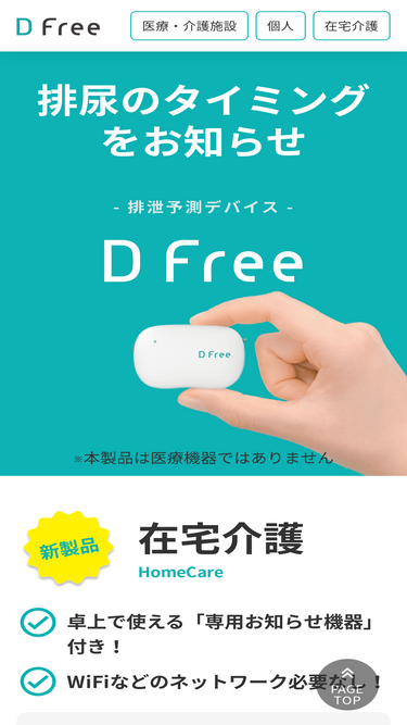 DFreeは、トイレ介護をサポートする排泄予測機器です。尿の蓄積量やトイレに向かうタイミングを通知することで、トイレの失敗回数を低減します。超音波を使って尿の蓄積量を計測するため、適切なトイレ介護のタイミングを逃しません。排泄に関わる介護負担の軽減が期待できます。