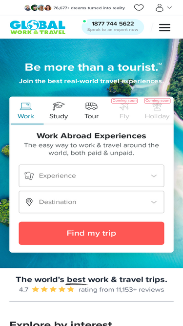 100%The easy way to work & travel around the world. Discover & join the best real-world travel experiences at the world's leading work & travel store. Work, Study, Tour, Fly + more!