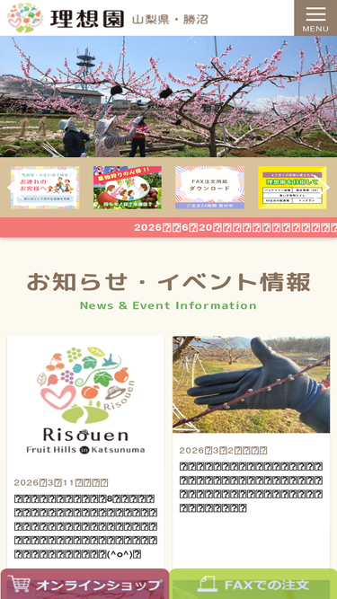 87%山梨県勝沼にある理想園は、「桃狩り」「ぶどう狩り」「ネット販売」の観光農園です。桃・ぶどうの生育状況や園内様子を紹介します。