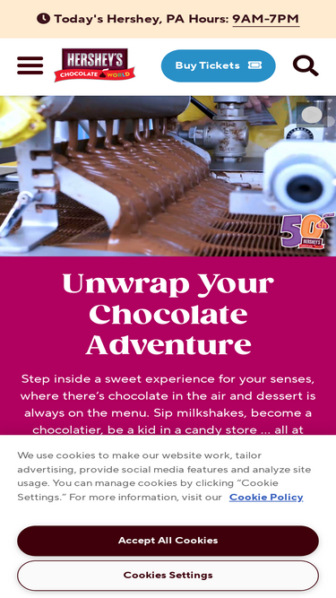100%Unwrap a chocolate adventure for your senses and be a kid in a candy store at HERSHEY’S CHOCOLATE WORLD Attraction. Plan your trip to Hershey, PA!