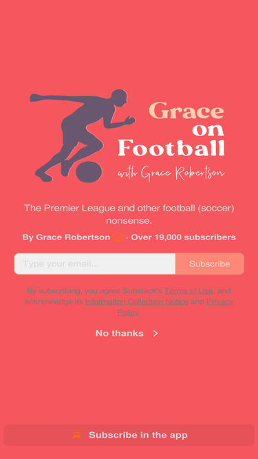 80%The Premier League and other football (soccer) nonsense. Click to read Grace on Football, by Grace Robertson, a Substack publication with tens of thousands of subscribers.