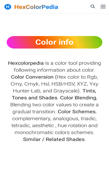 Hexcolorpedia, Color Conversion from hex to RGB, CMYK , Pantone , Lab colors. Color shades , Color Schemes, Tints, Tones, Preview the color and download solid color background and color scheme images.