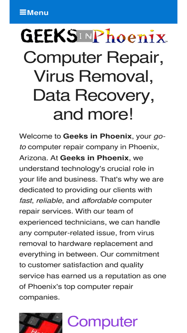 89%Computer Repair, Virus Removal and Data Recovery are our specialties at Geeks in Phoenix, serving Phoenix, Paradise Valley, Scottsdale, and Tempe AZ.