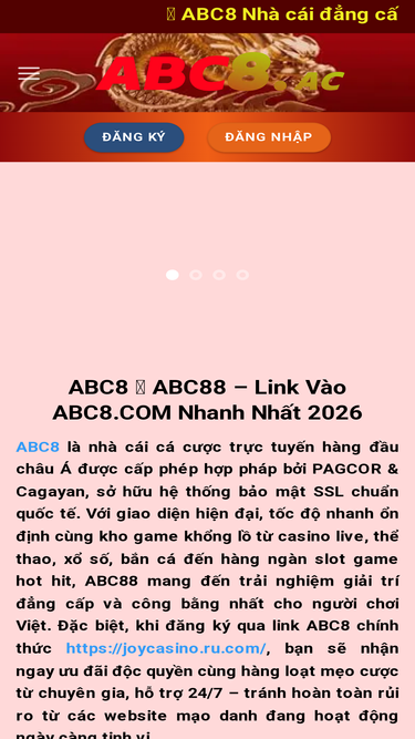 ABC8 là nền tảng cá cược trực tuyến hàng đầu hiện nay, cung cấp đa dạng dịch vụ cá cược từ: thể thao, casino trực tuyến, game slot, bắn cá,...